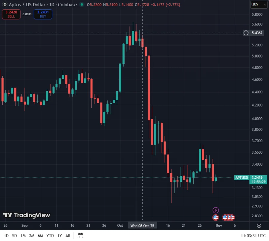 Technical indicators present that Aptos has proven outstanding resilience and is defending a key assist degree round $3.19 after the current correction. Like Bitcoin, Ethereum, and a number of other different altcoins, Aptos has skilled a downturn because the large market decline recorded on October tenth as a result of escalation of the US-China commerce battle. The value, at the moment $3.24, has fallen 0.1% and 29.1% over the previous week and month, respectively. Nevertheless, Aptos’ improve in lively addresses and each day transactions displays robust buyer engagement and a wholesome community.