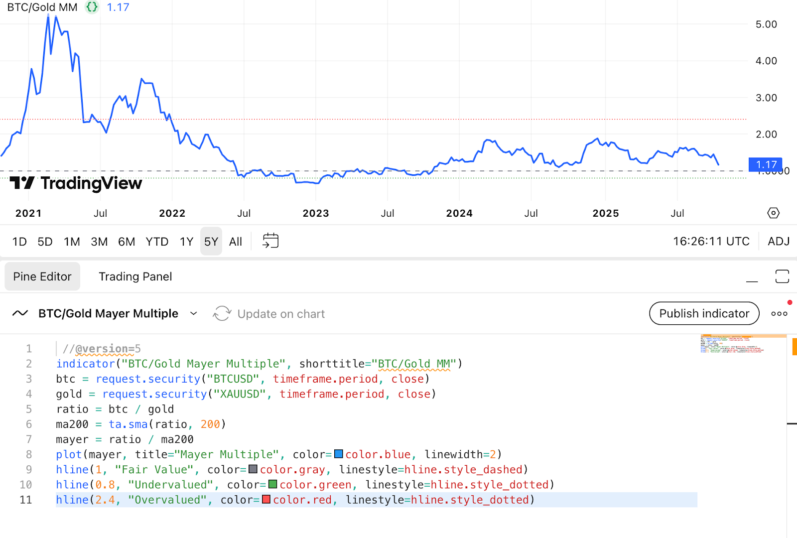 You’ll be able to additional complicate the Mayer a number of by evaluating the ratio of two property, reminiscent of Bitcoin and gold, as Consumer X did.