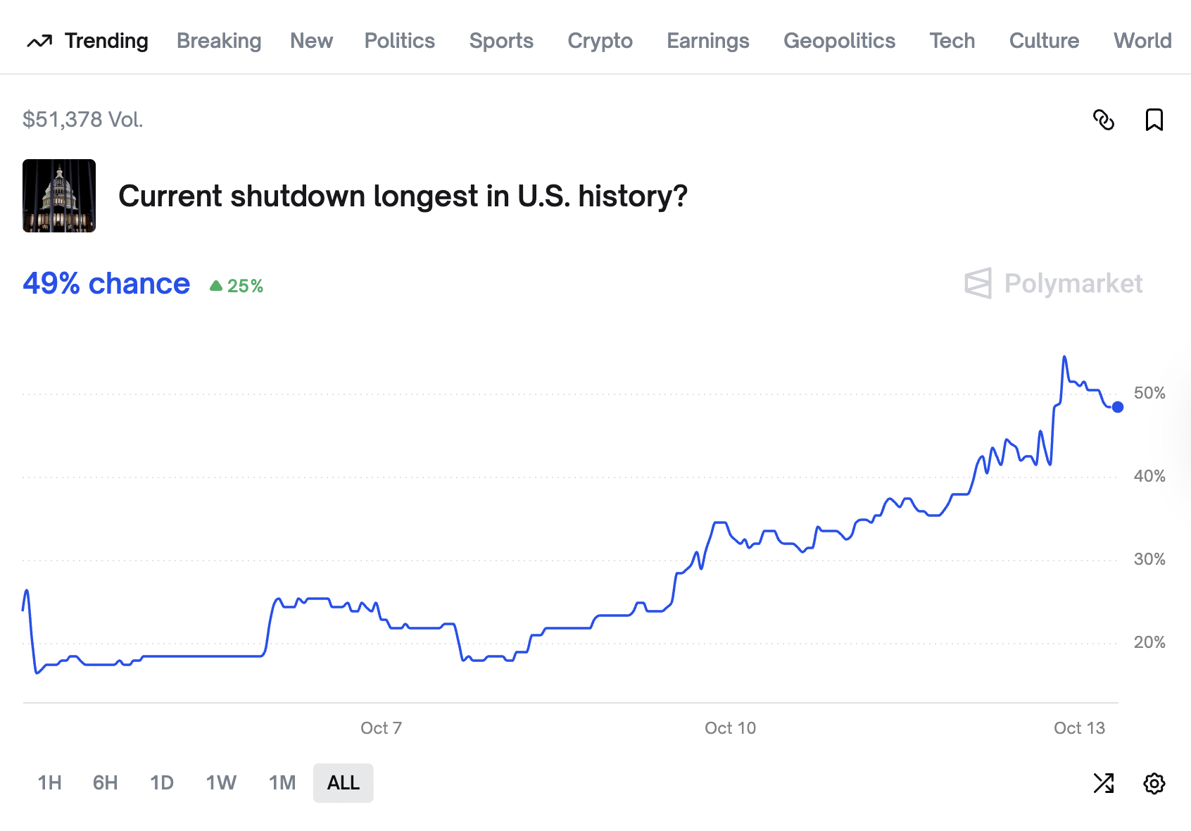 There’s a 49% likelihood this shutdown would be the longest in U.S. historical past, in response to Polymarket knowledge. This potential final result additional clouds the XRP ETF launch timeline.